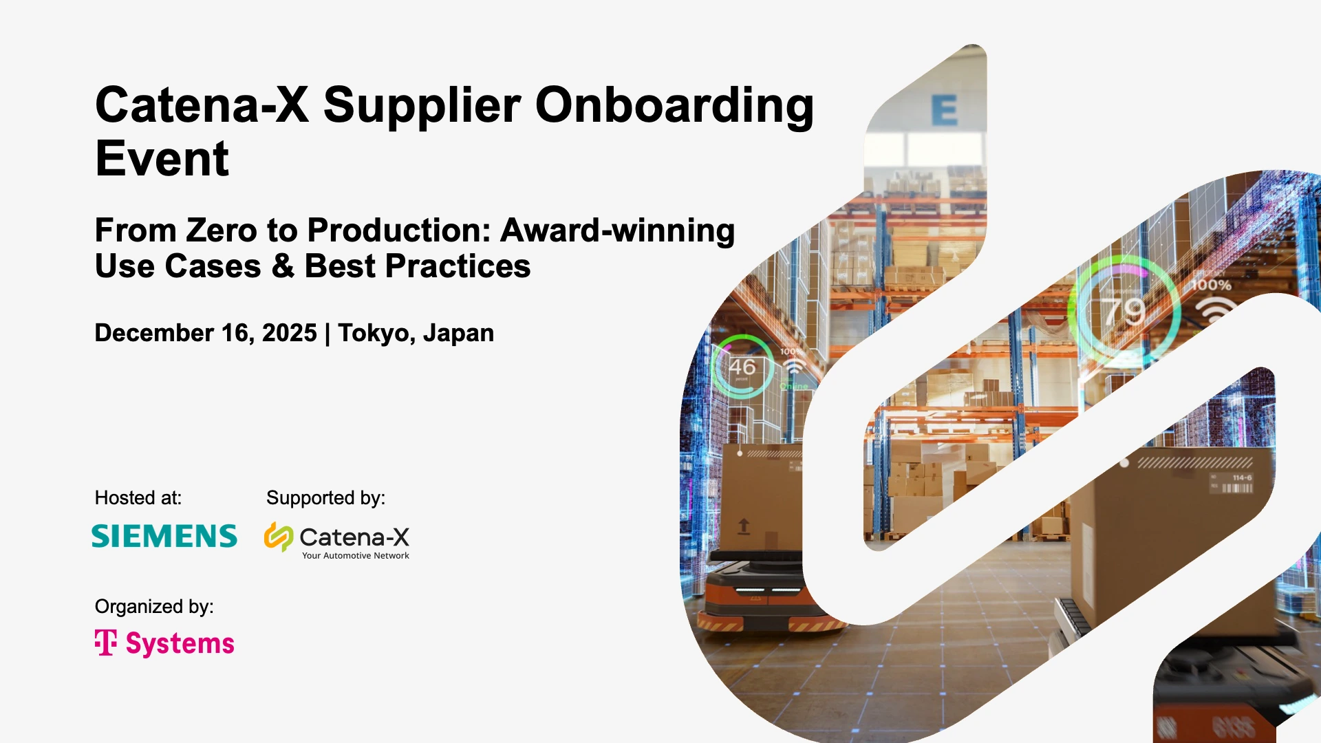 The Catena-X Supplier Onboarding Day is a free, in-person and online event designed to help suppliers streamline data exchange, meet new regulatory requirements such as Digital Product Passport and Product Carbon Footprint, and accelerate their integration into the Catena-X ecosystem through expert guidance, use-case insights, and onsite onboarding support.