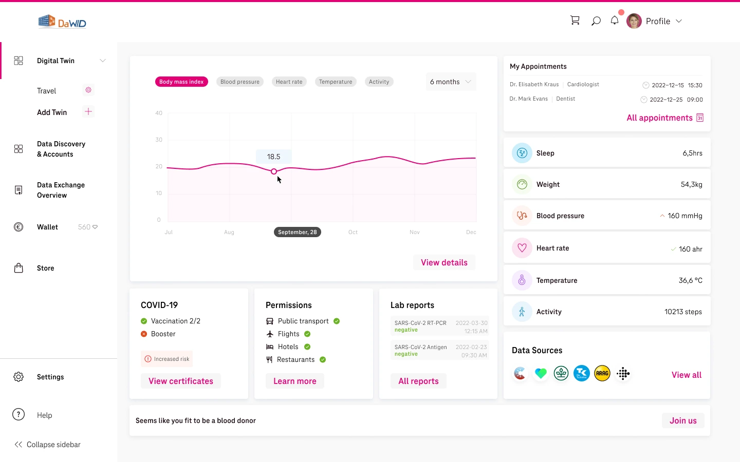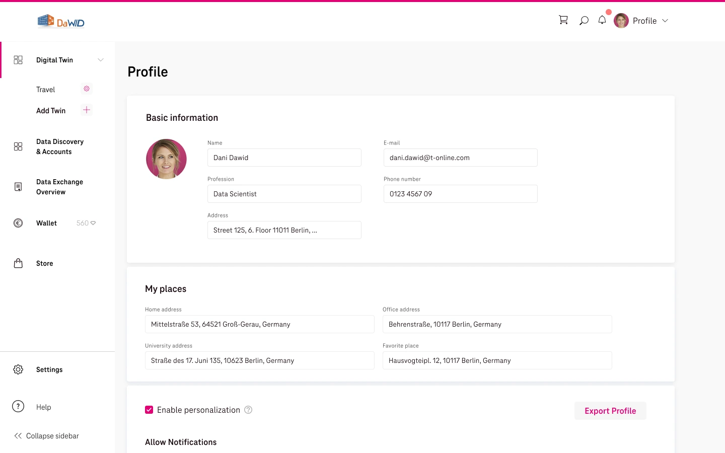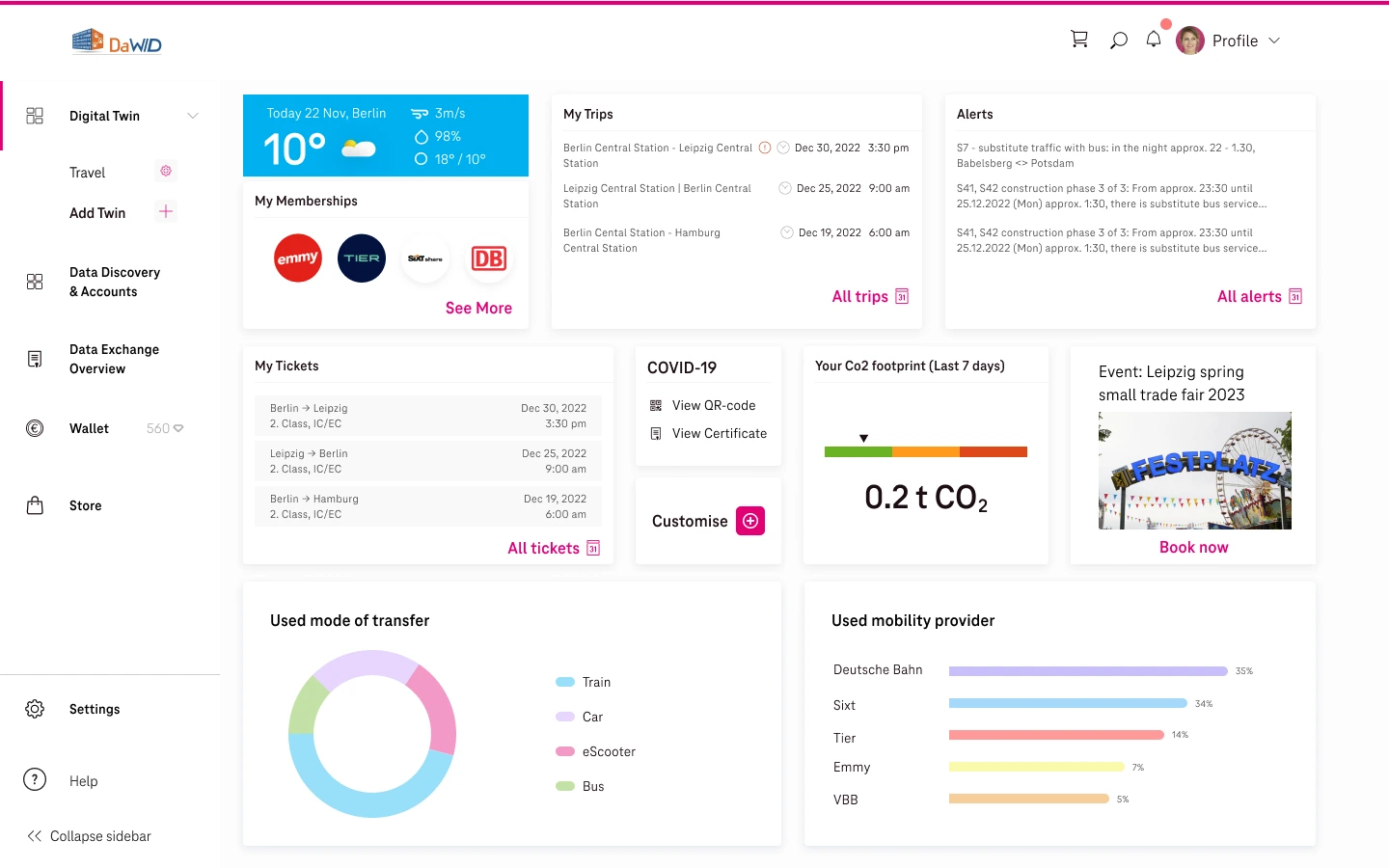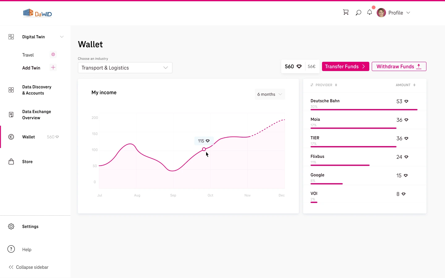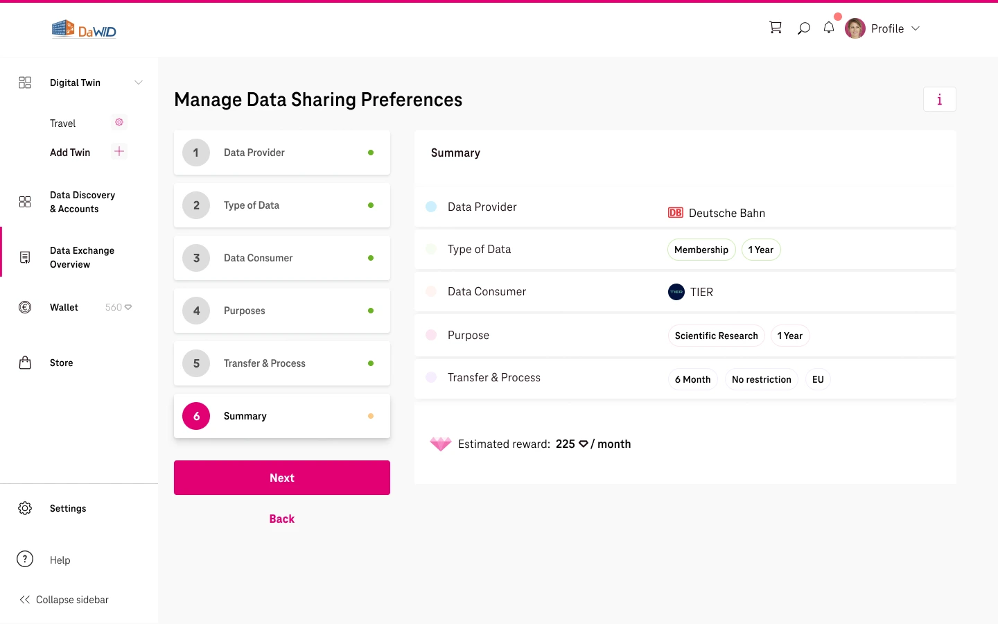 The demonstrator illustrates to citizens how their personal data is used. Through simple overviews, users regain the transparency and control that are the cornerstones of data sovereignty. Our proposed solution includes a data marketplace with a digital twin that helps citizens share their data. This directly engages individuals while adhering to ethical principles, including providing monetary or non-monetary consideration for data sharing. With DIH's "Build and orchestrate" solution, sovereign data spaces for sharing data can be created and managed with just a few clicks.