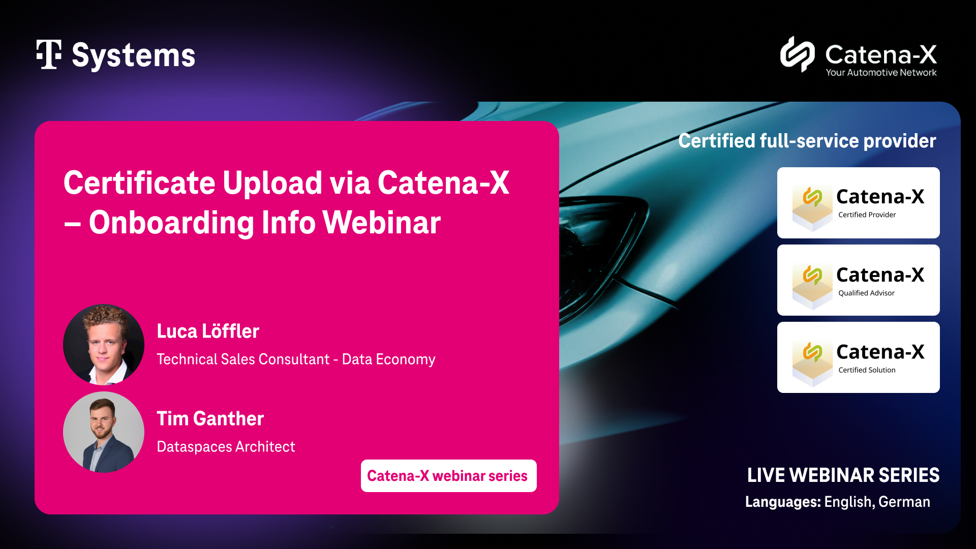This webinar is delivered by T-Systems International GmbH in close alignment with BMW as the selected Onboarding Partner of BMW. The content refers to the Catena-X “Certificate Management” (CCM) use case.