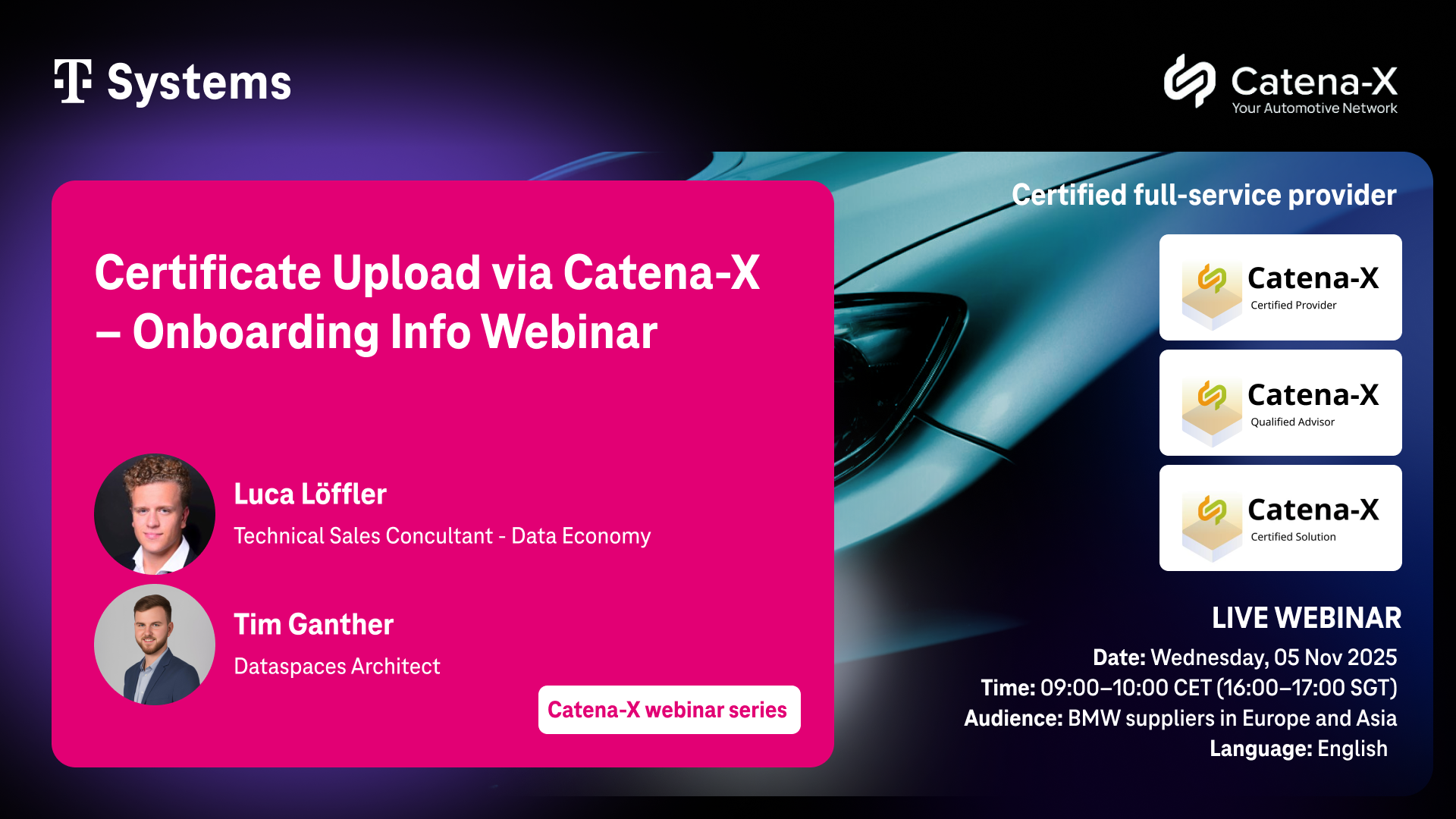 This webinar is delivered by T-Systems International GmbH in close alignment with BMW as the selected Onboarding Partner of BMW. The content refers to the Catena-X “Certificate Management” (CCM) use case.