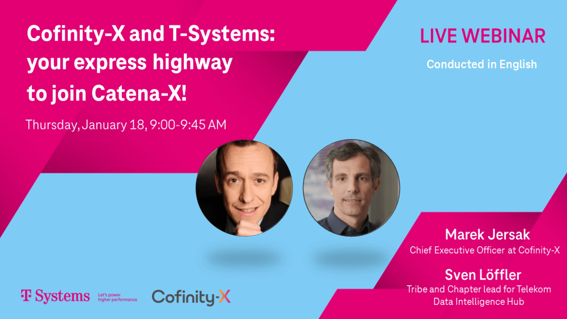 Marek Jersak, Chief Executive Officer at Cofinity-X and Sven Löffler, Tribe and Chapter Lead of Telekom Data Intelligence Hub, will be our speakers for this insightful session. During our webinar, you will discover the role of Cofinity-X in Catena-X ecosystem, and the essential steps to fuel your participation in Catena-X with T-Systems' IDSA and Catena-X certified solution. What’s more, gain valuable insights into optimizing data connectivity, enhancing collaboration, and unlocking the full potential of your data. Explore with us: