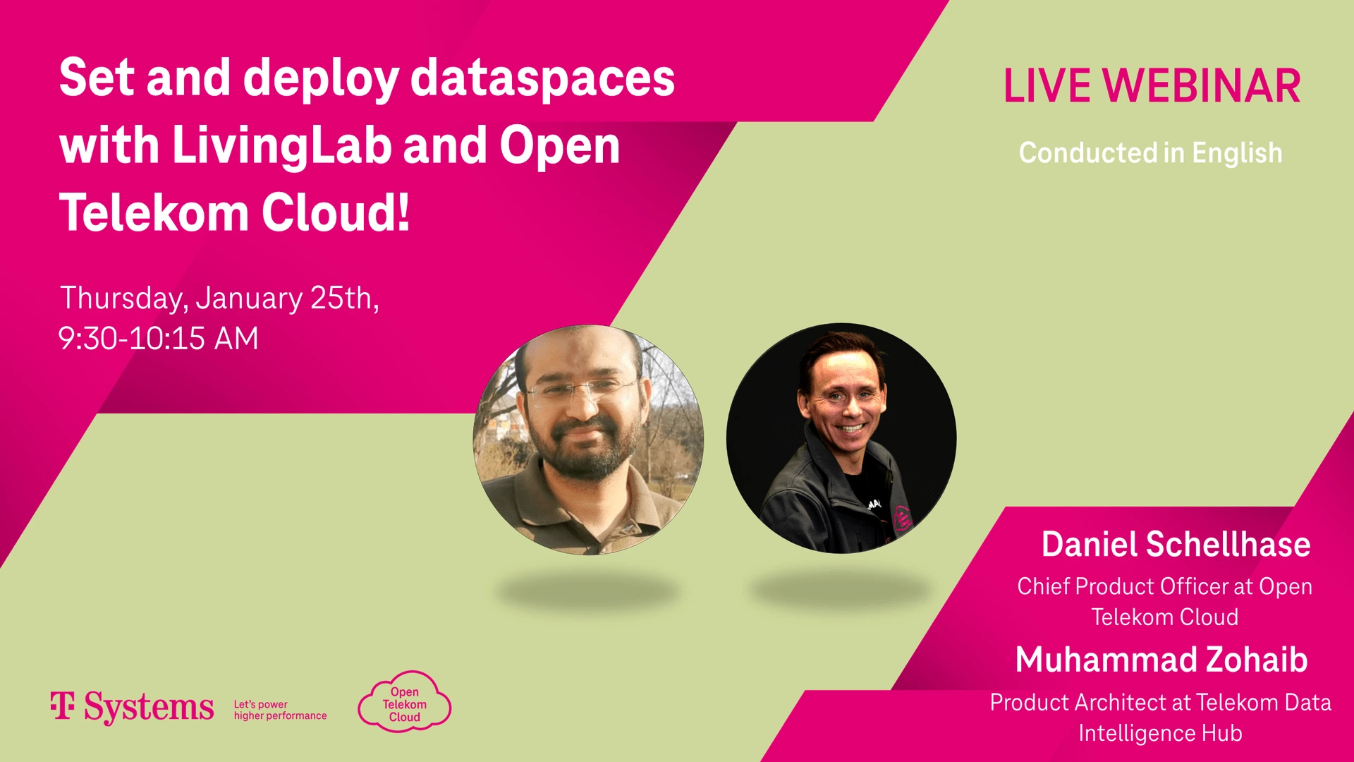 Daniel Schellhase, Chief Product Officer at Open Telekom Cloud (OTC) and Muhammad Zohaib, Product Architect at Telekom Data Intelligence Hub, will be our speakers for this exciting session. During our session, our speakers will guide you through the importance of dataspaces for value creation and how OTC contributes towards scalability, high flexibility and availability, while putting minimal development effort. What’s more, explore the relevant role of OTC as a cloud platform for LivingLab. Discover with us: