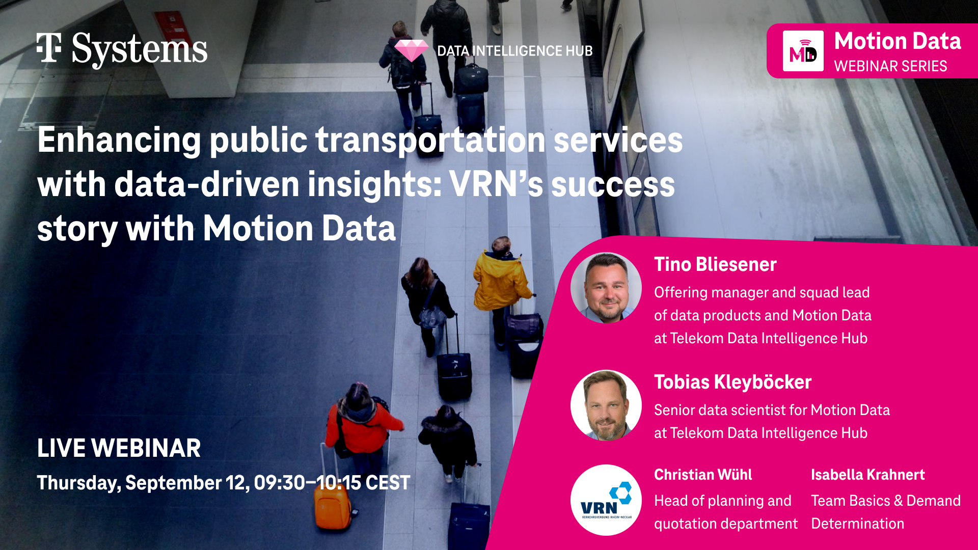 Join our expert speakers, Tino Bliesener, Offering Manager and Squad Lead of Data Products and Motion Data, and Tobias Kleyböcker, Senior Data Scientist for Motion Data, along with Christian Wühl, Head of planning and quotation department, und Isabella Krahnert, Team Basics & Demand Determination from VRN, as they guide you through the innovative world of mass movement analytics and its profound impact on public transport.